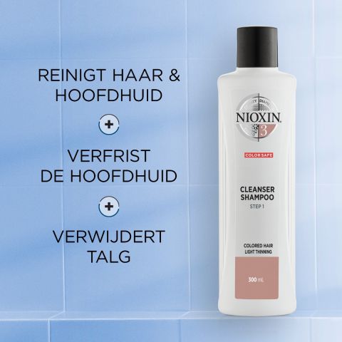 - NIOXIN System 3 Cleanser Shampoo 300 ml: helpt talg, vetten en vuil te verwijderen van de hoofdhuid en het haar.