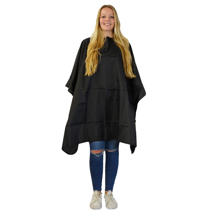 Nebur Kapmantel Basic Zwart met button sluiting. Maat is 141 x 134 cm. 100% geweven nylon. Luchtdoorlatend en waterafstotend.