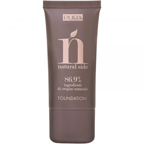 Met de Natural Side lijn wil Pupa de natuurlijke schoonheid combineren met glamour. Dit heeft geresulteerd in een productlijn met formules die 86% tot 100% natuurlijke ingrediënten bevatten. De kwaliteit en zuiverheid van de formule is hiermee gegarandeerd, zonder in te leveren op de prestaties van de make-up.Dé perfecte vloeibare foundation voor het gezicht. Heeft een licht, ‘tweede huideffect’ en geeft een egale teint met een natuurlijke en fluweelachtige finish. De foundation bevat voor 86,9% natuurlijke ingrediënten met SPF-6! Het product bevat Desert Date Oil en Orange Water met voedende eigenschappen. Vrij van parabenen, siliconen, vaseline, parfum en chemische filters.